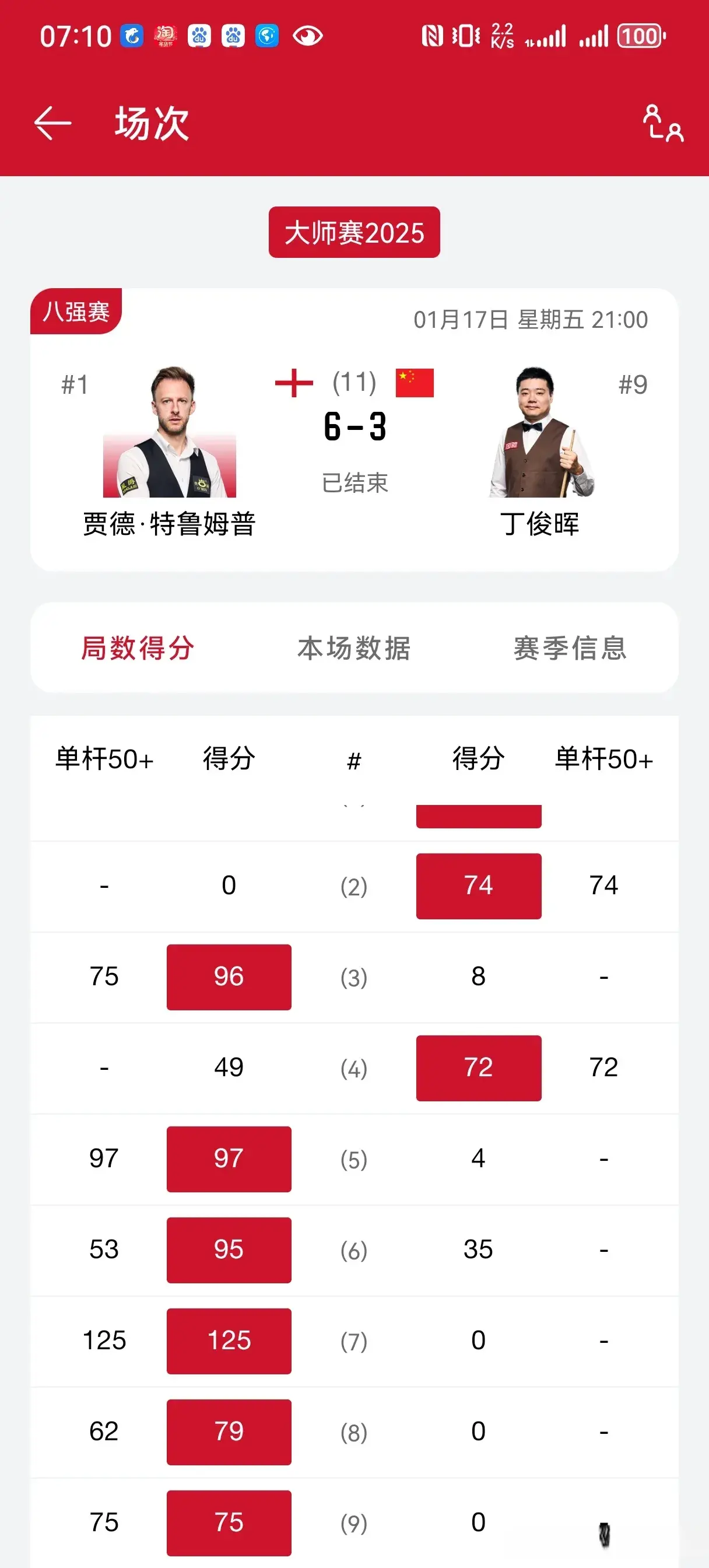 2024到2025赛季的斯诺克职业联赛继续进行,北京时间2025年1月18日,斯诺克大师赛四强全部锁定,特鲁姆普和凯伦威尔逊再次会师,然而中国斯诺克全军覆没,丁俊晖无缘四强,仍然获得4万英镑安慰奖,此外布雷切尔不敌凯伦威尔逊,和丁俊晖一起打包回家!