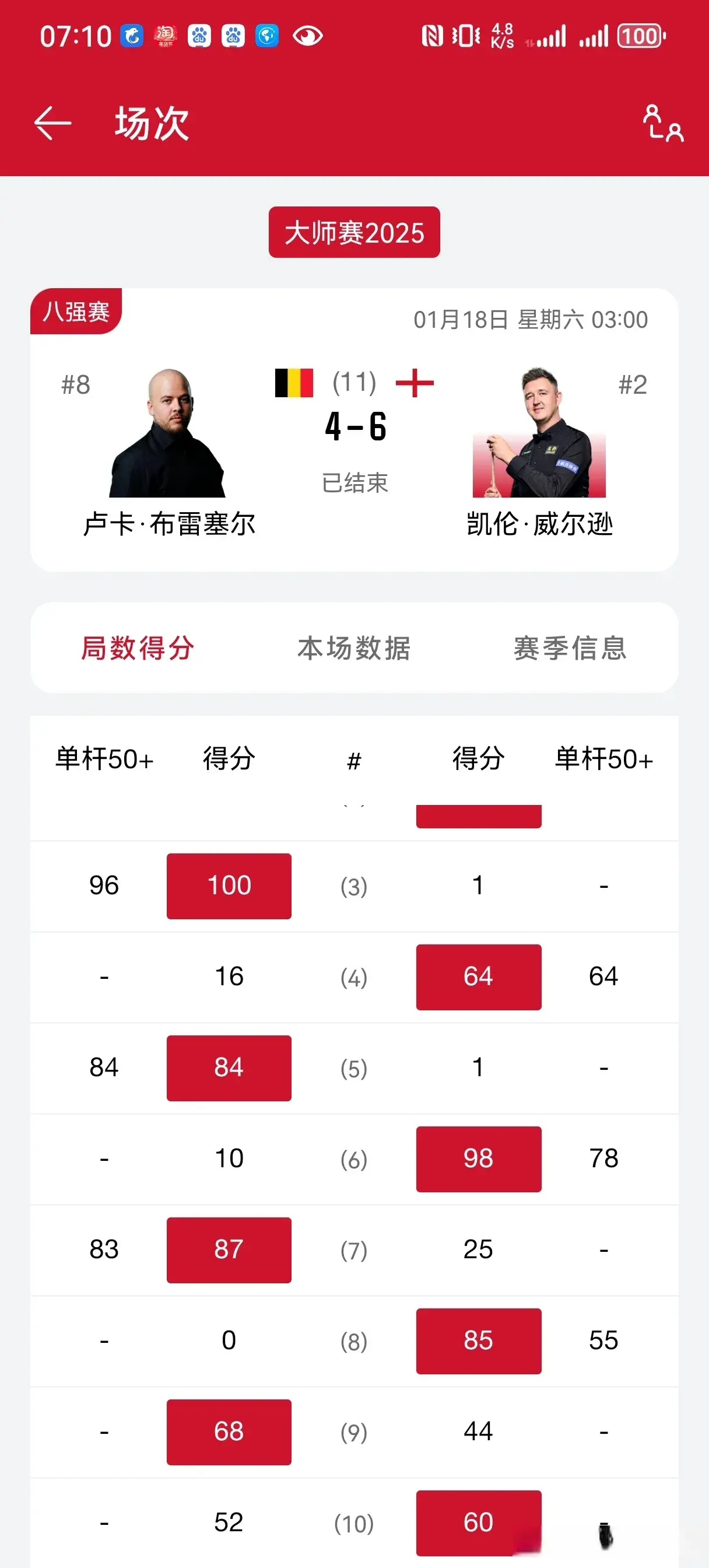 布雷切尔对阵凯伦威尔逊此前交手记录还占据一定优势,然而本赛季状态持续低迷,而且是颗粒无收。面对实力强大的凯伦威尔逊,这场比赛堪称是世界冠军之争,布雷切尔没能顶住压力,再次证明自己,凯伦威尔逊更是冲击大师赛首冠重燃希望。一上来凯伦威尔逊,2比0打的布雷切尔措手不及,随后也是好景不长,1比3落后,接下来两个人你来我往,双方是各赢一局,打的难分难解,最后时刻,布雷切尔一度比分来到4比5,无限接近最后胜利,还是没能逆袭成功,最后时刻遗憾倒下,这样,凯伦威尔逊是6比4绝杀晋级,两个人的战绩回到5胜5负!布雷切尔赛后是泪洒赛场!遗憾倒下!没能创造奇迹!